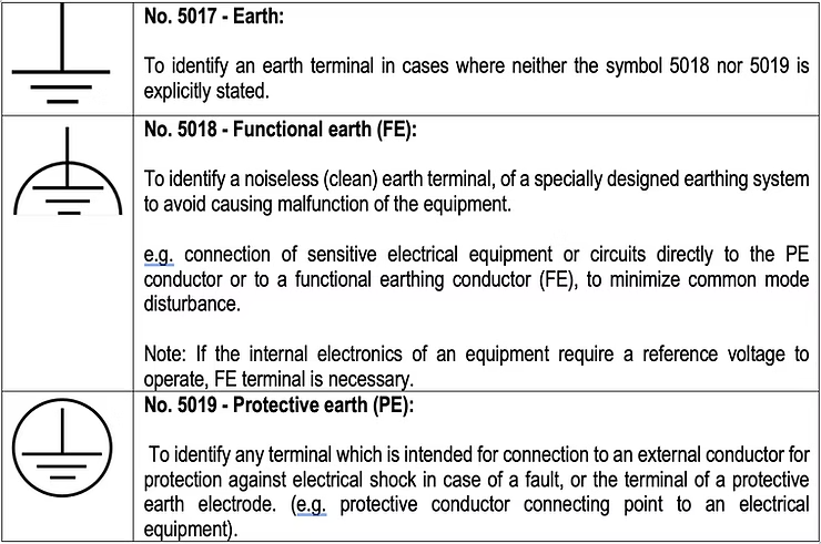 Class 1 equipment may require separate terminals with symbols 5018 and 5019, depending upon its design. Class 2 and Class 3 equipment doesn’t require Protective Earth but Functional Earth may be required. In such case, appropriate markings shall be included in the product. This means the manufacturer while designing, manufacturing and testing the product shall decide requirements of reference potential for electronics and provide such provisions. While installing the buyer shall ensure a perfect reference for the FE terminals, by implementing appropriate bonding topologies. Finally FE and PE are connected at “one place”, to avoid circulating current through Functional Earthing and Functional Bonding networks. (Note: common bonding network is also possible.)