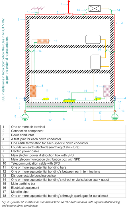 ESE sold in India are with one rod claiming up to 100-meter radius of protection, one down conductor and one or two earth pits. The ESE vendors claim this as per NFC 17-102. Refer the picture in annexure -1 (which is fig 1 under clause 1.4.3 of NF C 17-102, Components of LPS).