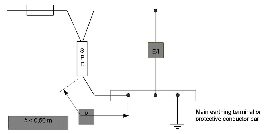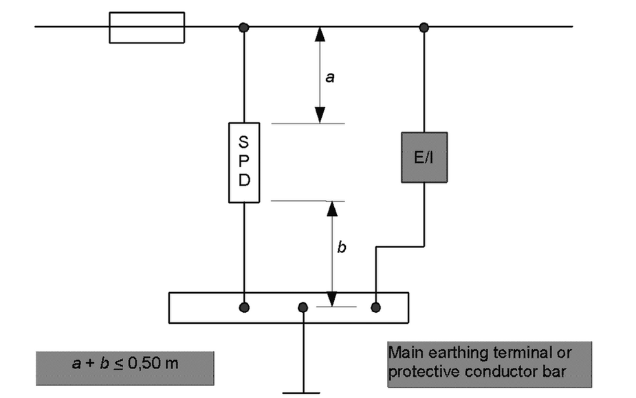 Because increasing the length of the connecting conductors of SPDs reduces the effectiveness of overvoltage protection, optimum overvoltage protection is achieved when all connecting conductors of SPDs are as short as possible (preferably not exceeding 0.5 m for the total lead length) and without any loops (see Fig. 59). If distance a + b (see Fig. 59) cannot be reduced below 0.5 m, the scheme in Fig. 60 may be adopted.