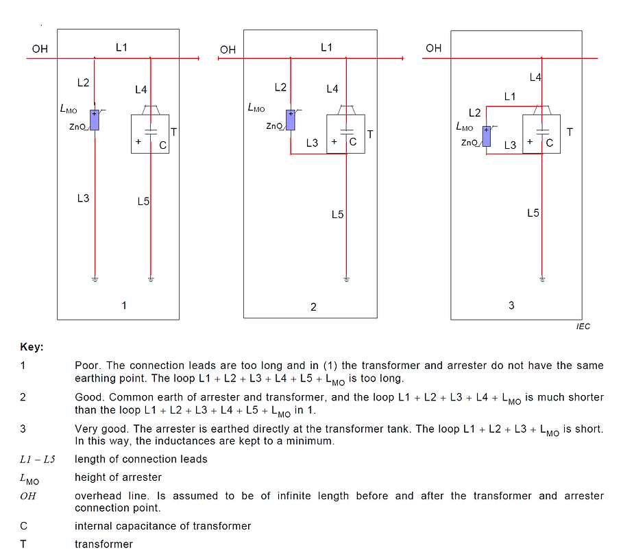 The location of the distribution arrester relative to the protected equipment can be very important when considering the fast rising lightning surge. When protecting from fast rising surges the lead length in series with the arrester and in parallel with the protected equipment can generate a significant voltage due to its inherent inductance. This lead voltage is in addition to the fast front characteristics of the arrester. The connections shall be installed as short and straight as possible. This is because inductive voltages appear at each conductor due to the self-inductance during the flowing of the impulse current. These inducted voltages are considerable during high rate of changes di/dt, such as when lightning currents occur. The MO material itself reacts almost instantaneously even with very steep voltage and current impulses In view of the dimensions of the arrester itself and the connections, there are always inductive voltages and it is necessary to take them into account. If the residual voltages found in the datasheets do not contain an inductive voltage drop corresponding to 1 μH/m of arrester length, then the arrester height must be considered.