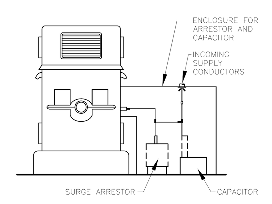 Arresters should be as close as possible to the equipment to be protected and to ground. The same fundamental reasoning applies to the installation geometry of rotating machine surge-protective equipment (see Figure 2-8). A box, shelf, or bracket directly adjacent to the emerging leads from the machine can accomplish the desired objective.