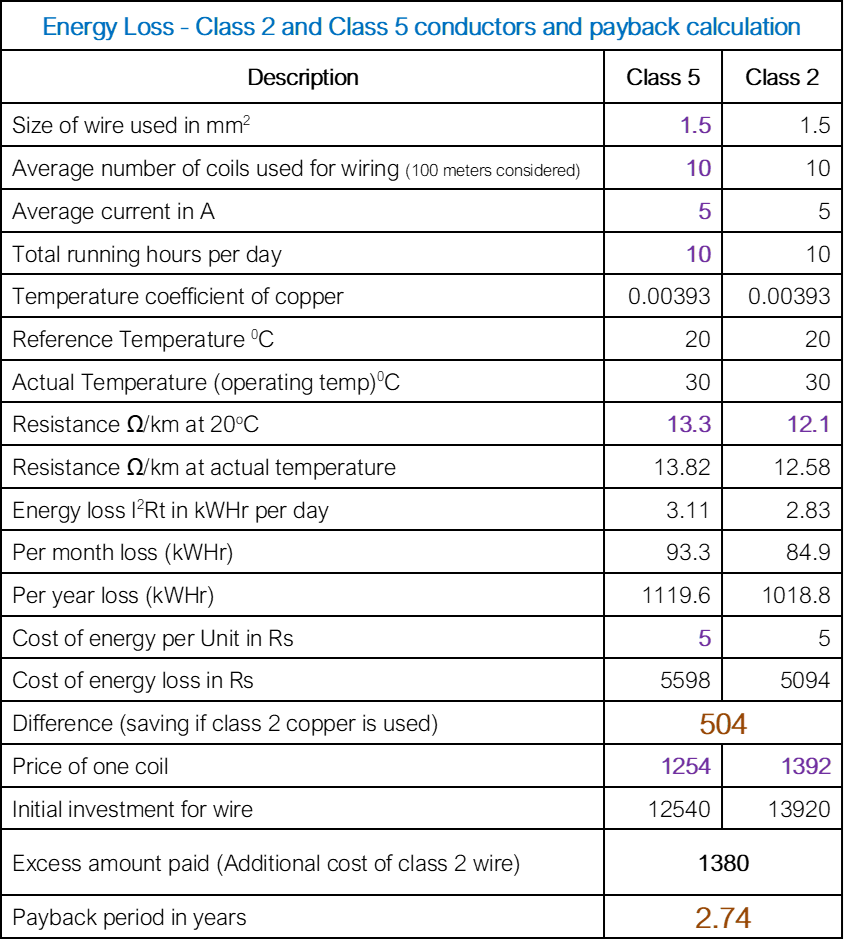 Introduction: Fixed wiring (also called as conduit wiring or building wiring or house wiring, depending upon the application) in India now a days use copper wires with class 5 copper conductor. This is common not only in residential application, but industrial and commercial application as well. The reason is copper wires with class 5 conductor is cheaper in comparison to copper wires with class 2 conductor (approximately 8 % cheaper). On the other side these coper wires with class 5 conductor can bring disaster in a building as it increases the disconnection time of protective device due to its increased resistance. The power loss of class 5 conductor is higher and is against the concepts of energy conservation or sustainability.