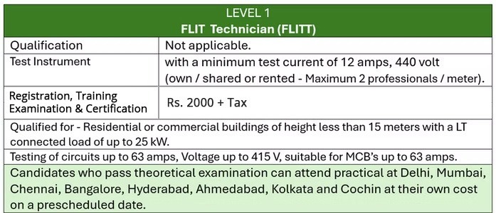 FLIT is a part of Verification to ensure efficiency of automatic disconnection of supply, thereby ensuring some amount of safety against electric shock and fire effects (fire) in Low Voltage Electrical Installations.